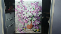 Сирень – красивый и живописный цветок вне зависимости от вида. Особенно хорошо смотрится сочетание двух видов сирени – белой и фиолетовой. Авторы картины (семья Захаровых), внесли в свое творение интересную деталь. Они добавили несколько желтых одуванчиков, которые не бросаются в глаза, но прекрасно дополняют композицию.